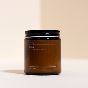 This mini candle is hand-poured into amber glass jars with modern minimalist labels and a black metal lid.