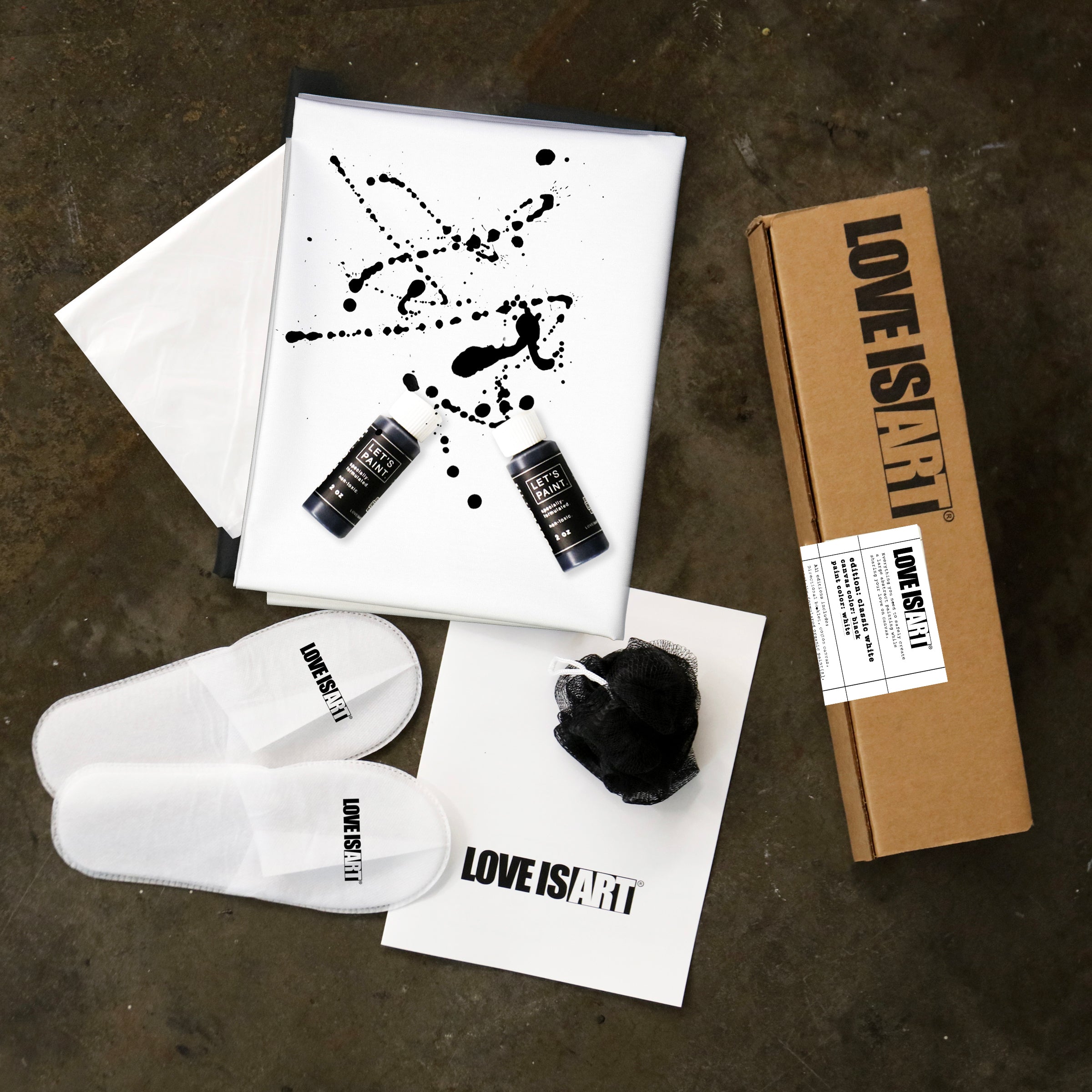 The Couples Art Kit - Starter Kit - White Canvas & Black Paint edition includes all of the materials you need to safely create an abstract painting while being intimate with the one you love. This special edition comes with a solid black canvas and a vibrant matte white paint, perfect for those looking for an edgy yet classic painting.
